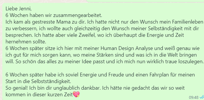 Meine Kunden saßen bisher nur staunend und nickend im Gespräch. Es hat ihnen soviel Mut und Stärke mitgegeben für ihren Weg. Wir schauen auch gemeinsam wie du die neuen Erkenntnisse umsetzen kannst.