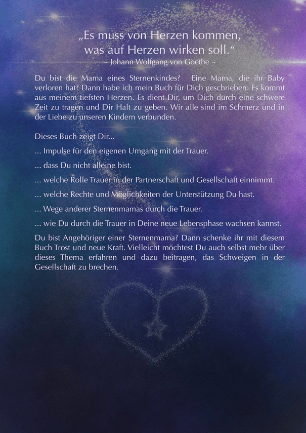 Ab Juni 2021 ist mein „Mutmacher für Sternenmamas“ hier erhältlich. Zu meinen Krisen und schmerzhaften Erfahrungen gehört auch der Umgang mit Trauer. Ich habe meinen Bruder und mein Baby verloren. Im Mai 2020 hatte ich die Vision ein Buch für Sternenmamas zu schreiben und jetzt ein gutes Jahr später ist es fast fertig. Bereits vorab teile ich hier exklusiv für euch die Rückansicht des Buches.